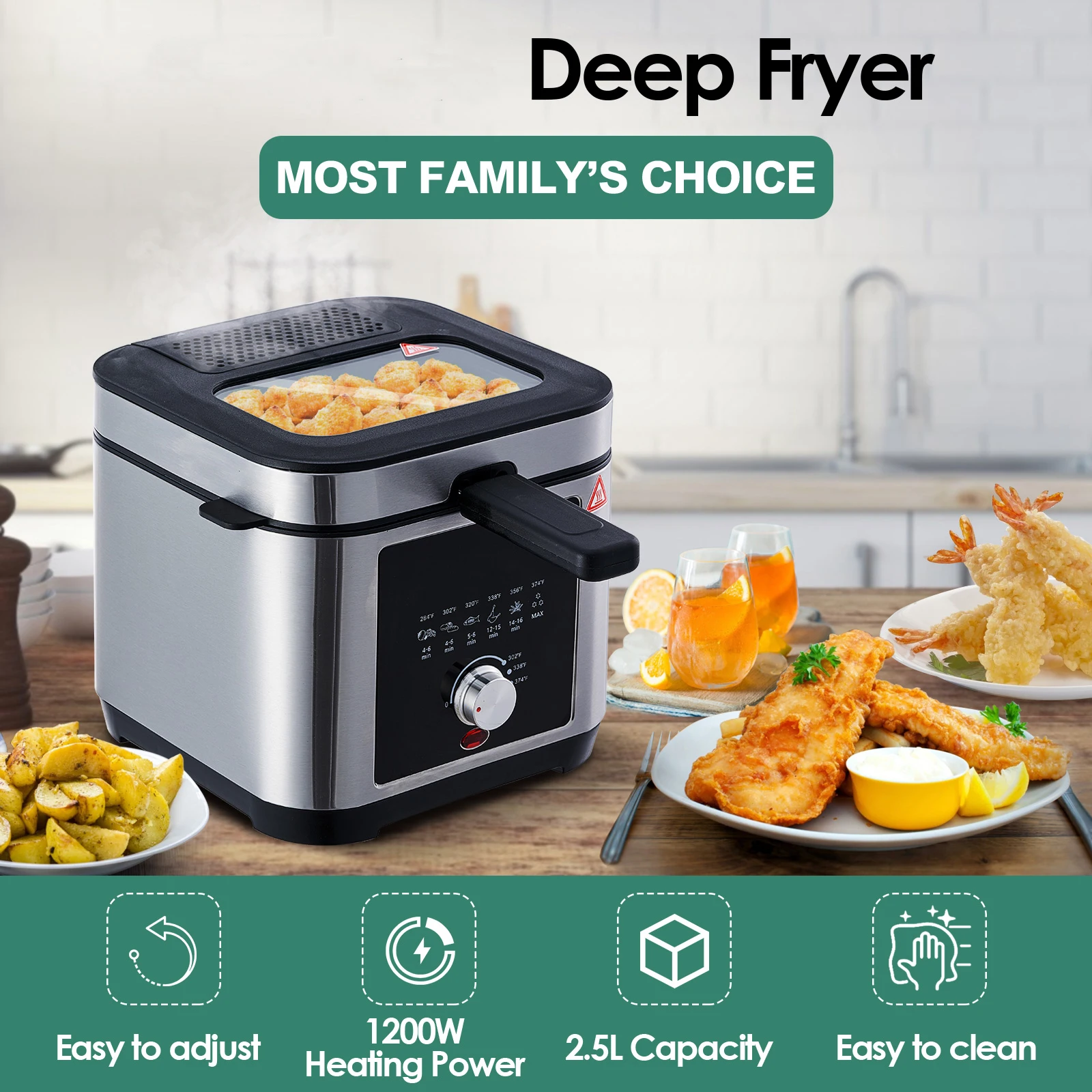 220-240V, 50/60Hz, 1200W Capacity: 2.5L Brushed S/S housing Variable temperature: 150-190?? Temperature control by thermostatRemovable lid with large window and filter Non stick coated, fixed oil tank with non sitck coating Cool-touch handle Indicatorlight Overheat protection
